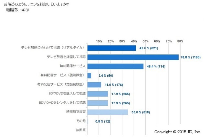 2015年は動画配信の利用拡大がたびたび言及されたが、アニメの視聴方法で最も利用されたのはテレビであった。特にBlu-ray、DVDレコーダーなどを利用した録画は全体の78.3%、約8割が利用している。