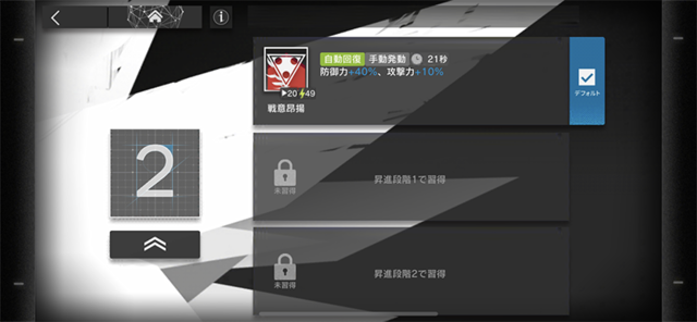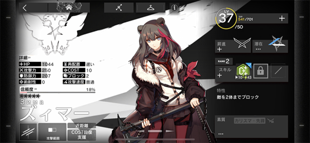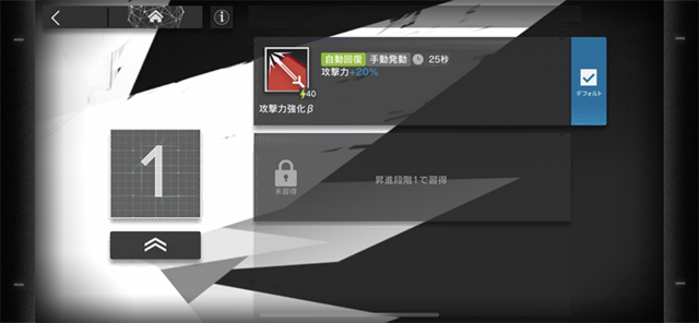 重装とは真逆のアプローチになりますが、守備力の高い敵でも屠ってくれる攻撃力を持つ「前衛」の役割は大きいです。高レアリティー程えげつない性能なのですが、事前登録特典で配布されたこちらも優秀でした。高い攻撃力に加え、第1スキル「強撃β」によって攻撃力が175%まで上昇します。