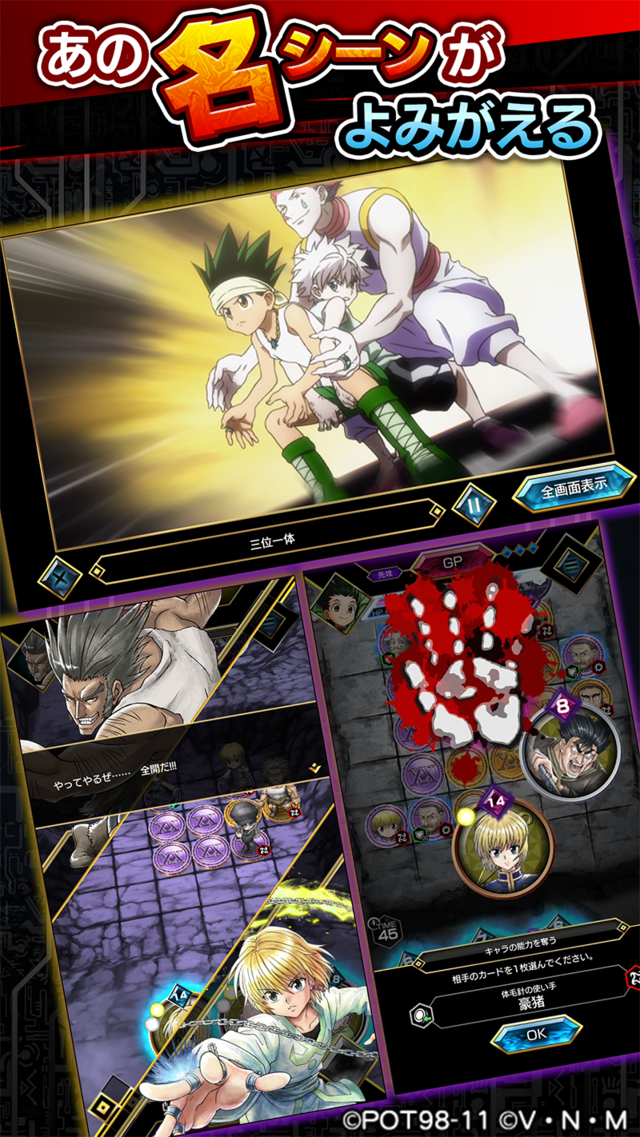 アニメ『HUNTER×HUNTER』の魅力である「頭脳戦×心理戦」を最大限に体感できるカードバトルゲームです。本作では、プレイヤーは「念能力」でカードを具現化する力を持ち、30枚のカードで編成したデッキを操り、盤上でのバトルに挑みます。