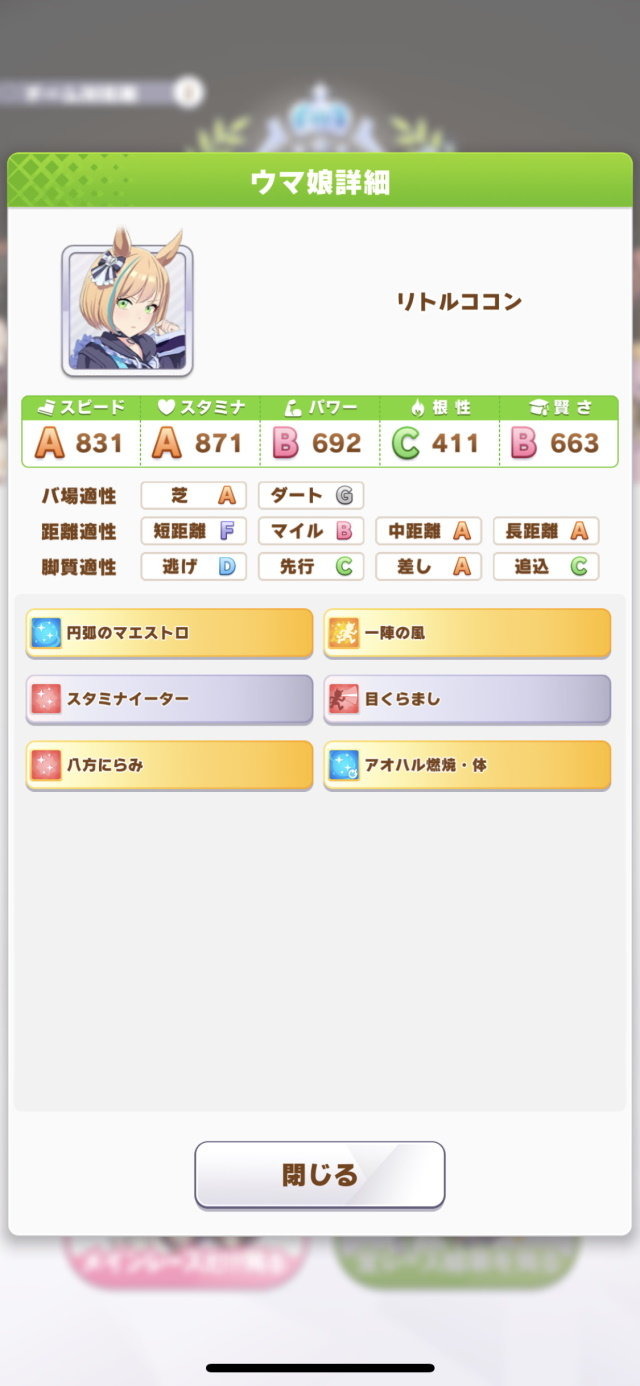 というわけで、初回の育成結果はこのようになりました。普段の育成スコアは9,500~10,500なので、初回にしては良い出来です。アオハル魂爆発によるヒントレベル獲得チャンスも多いので、ノウハウさえ学べば「新設!URAファイナルズ」で届かなかった強いウマ娘を作れる気がしてきます。