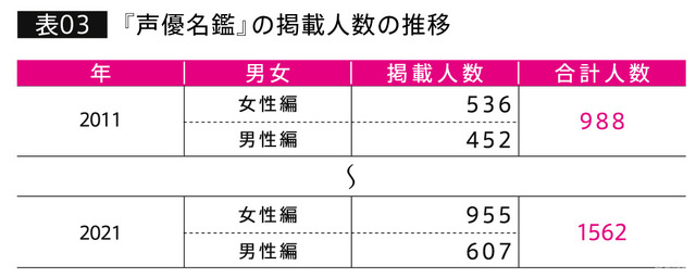 また、アニメの人気上昇に伴い声優の需要も増加している。声優のデータベースとして業界でも使われている「声優名鑑」に掲載されている声優の数を比較すると、2011年には988人だったことに対して2021年には1,562人と、10年で約1.5倍に増加している(表03)とのことだ。