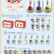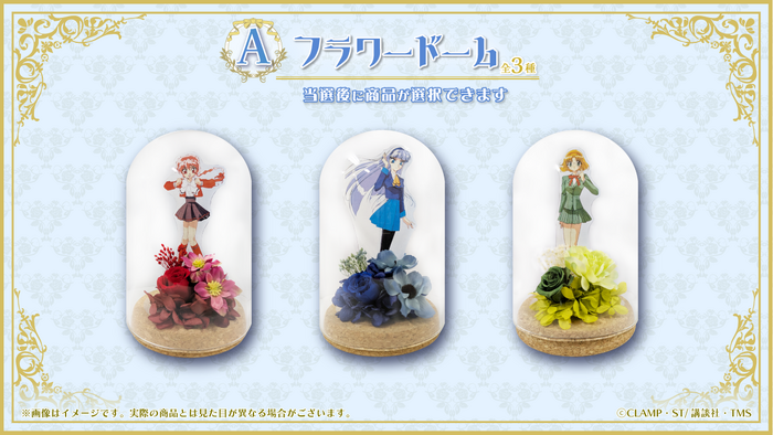 A賞は、アニメ画の光、海、風の3人をモチーフにしたお花があしらわれたフラワードーム。B賞のポリエステルミニポーチ、C賞のミニキャラアクリルスタンド、D賞のアクリルキーホルダー、E賞の缶バッジには、描き起こしミニキャラがデザインされた。
