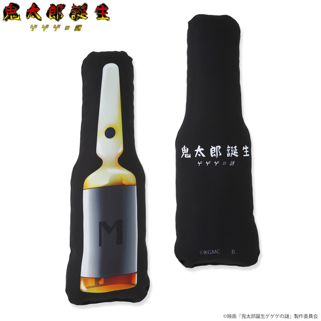 小物入れや鞄に付けて楽しめる「目玉おやじポーチ」、鬼太郎の父と水木がデザインされた「お風呂バッグ」「ポーチ」「リバーシブルトートバッグ」、さらに蓄光インクを使用して暗闇で「光る!Tシャツ」、なんと作中で龍賀製薬が作っていた“血液製剤M”の「ダイカットクッション」も。