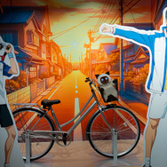 ロッカーの向かい側には桃城の自転車が展示されている。背景の街並みも合わさって、桃城とリョーマが2人乗りをしている風景が浮かんでくる。リョーマの愛猫・カルピンもカゴに乗っており、かわいさと高い原作再現のクオリティに心が踊る!