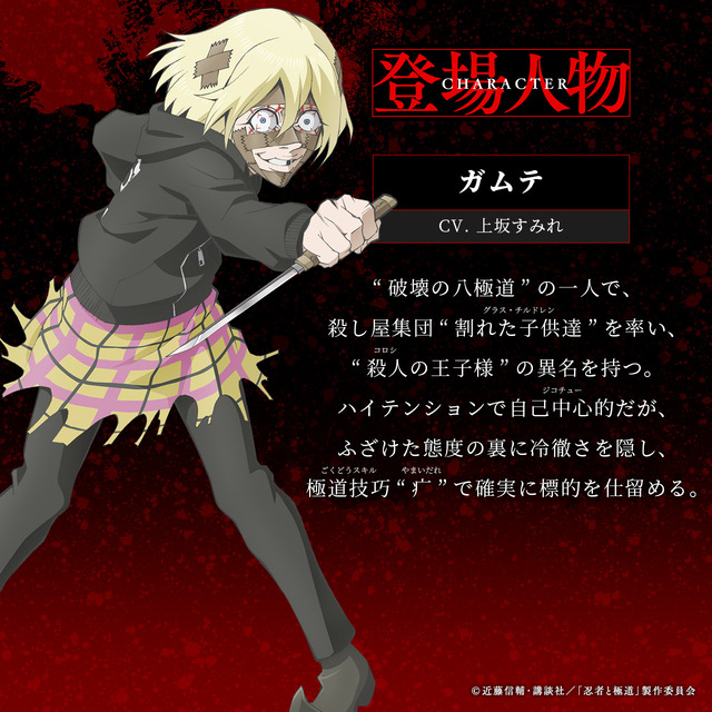 心沸き立つ激闘の数々にドキドキワクワクする作品です!! ガムテを演じるにあたっては、明日や明後日のことを考えず一生懸命殺すことを頑張りました! クレイジーで頑張り屋さんなガムテをよろしくお願いいたしますっ!