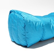 付属の収納袋に入れると、約直径20cm×長さ40cmに収まる。-2度対応の寝袋がこのコンパクトさに収まるのは良質の生地とダウンと使用している証。ドローコードが2本付いていて、収納しやすくなっている。
