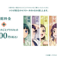 店舗への入館時に、入館料金と「薬屋のひとりごとプラスセット」を購入することで、コラボ限定マフラータオル(猫猫、壬氏、小蘭、子翠、集合の全5種)がランダムで渡される。「薬屋のひとりごとプラスセット」は1,100円(税込)。