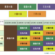 薬屋の湯、猫猫の湯、壬氏の湯、小蘭の湯、子翠の湯。浴室には特別にデザインしたタペストリーで装飾した5種類のコラボ風呂が楽しめる(コラボ風呂スケジュールは店舗によって異なる)。