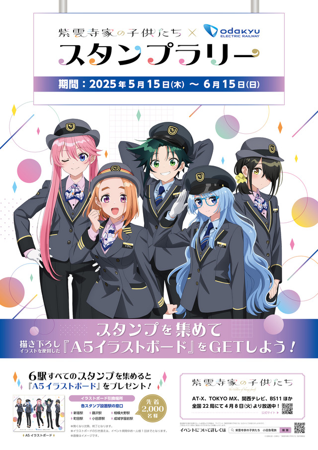 このTVアニメ『紫雲寺家の子供たち』と小田急電鉄によるコラボレーション企画は、6月15日まで行われる。期間中、新宿、成城学園前、町田、相模大野、小田原、藤沢の駅を対象にしたスタンプラリーをコンプリートした先着2000名には、A5イラストボードのプレゼントを実施している。