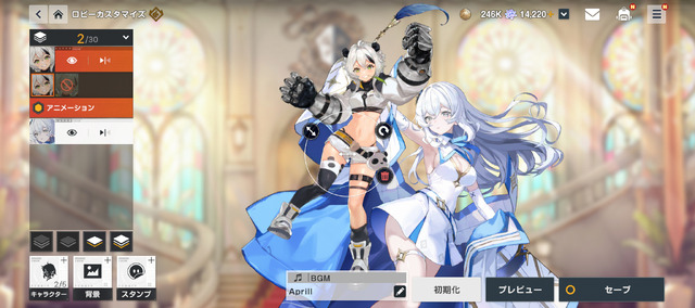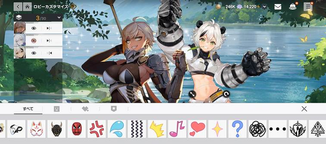 しかも1名だけではなく2人でも3人でも! さらに各キャラは拡大縮小が可能。背景やスタンプも好きにレイアウトできますから、お気に入りのキャラたちを自分だけのロビーで愛でられるというわけです。