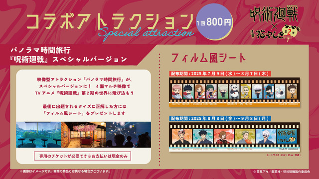 4面マルチ映像のアトラクション「パノラマ時間旅行」が、『呪術廻戦』仕様のスペシャルバージョンになった。アニメ第2期を振り返り、最後にクイズコーナーも用意される。