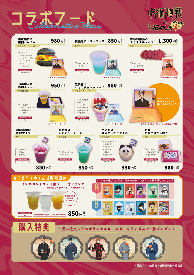 「虎杖悠仁の黒閃バーガー」「釘崎野薔薇のおなまえチュロス」「伏黒恵のゼリーソーダ」「七海建人のお団子セット」「五条悟のいちごチョコクレープ」などを用意。