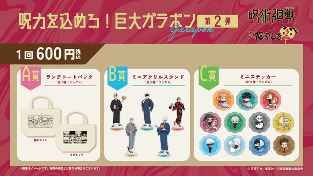大きなガラポンを回して景品をゲットしよう! 出た玉の色によって必ず景品がもらえる。景品はA賞「ランチトートバッグ」、B賞「ミニアクリスルタンド」、C賞「ミニステッカー」だ。料金は600円(税込)。