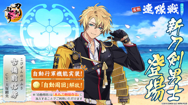 そんな本作では、7月1日のメンテナンス後より、大塚剛央演じる新刀剣男士「古備前信房」が「連隊戦 ~海辺の陣~」の報酬として登場した。イラストを先崎真琴が手掛ける古備前信房は、刀種が太刀、刀派が古備前のキャラクターだ。