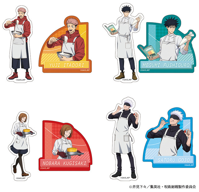虎杖悠仁、伏黒恵、釘崎野薔薇、五条悟がエプロンを着けて調理実習中の姿を描いた新グッズ「調理実習Ver.」の登場だ。泡立て器やホイップクリープを手にした4名の姿はいつもと違って新鮮だ。