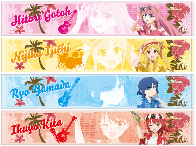 アニメ『ぼっち・ざ・ろっく!』より、結束バンドのメンバーたちがアロハ衣装を身に着けたグッズが新たに登場。夏にピッタリの「冷感マフラータオル」、メンバーたちとおそろいの「アロハシャツ」などがリリースされ、全国のアニメイトでもフェアが開催される。