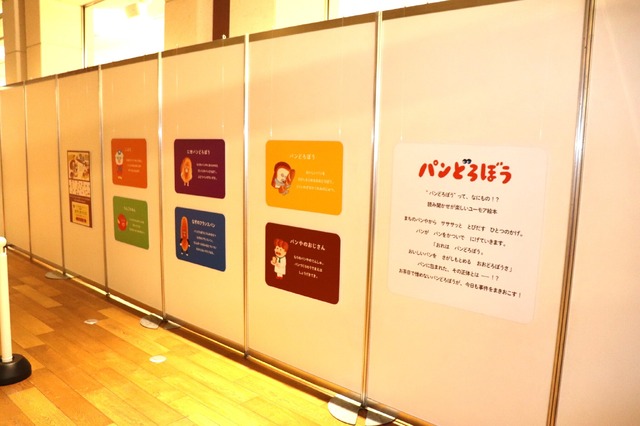 入口を入ると右手に絵本『パンどろぼう』のストーリー紹介と、かわいらしいキャラクターのイラストパネルが並び、作品の魅力を改めて体感できます。初めてパンどろぼうに触れる人でも、まずここを読むことで物語が理解しやすい工夫がされています。