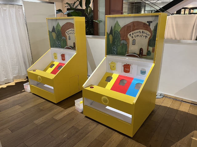 2つ目のボール投げは、異なる3色の穴が空いていて、その穴の中に同じ色のボールを入れるアトラクションです。ボールを全て穴の中に入れることができたらクリアになります。クリアすると後ろの「もりのパンや」のイラストに変化が……!? 変化の内容はぜひ会場で確かめてみてください。