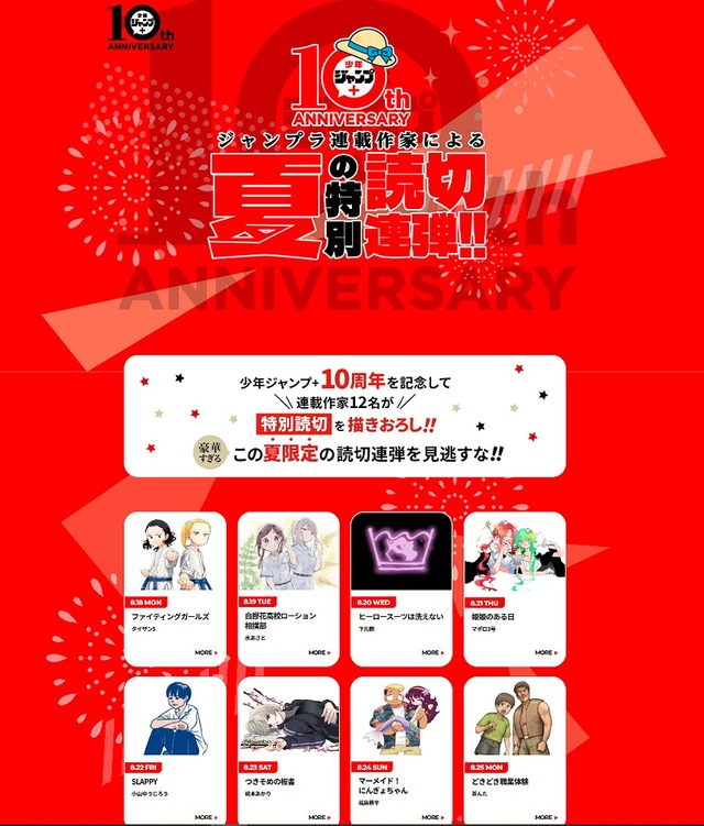 このたび、そんな「少年ジャンプ+」がローンチから10周年を迎えることを記念して、8月18日から「少年ジャンプ+」連載経験作家陣12名による「夏の特別読切11連弾」をスタート。多彩な作家陣の新作が登場する。
