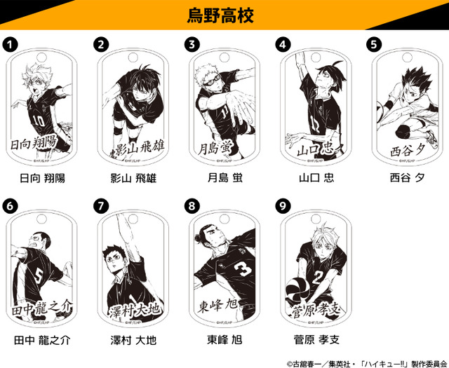アニメ『ハイキュー!!』のキャラクタービジュアルが刻印された、アクセサリー感覚で持ち歩ける「ハイキュー!! プレミアムドッグタグ」は3,000円+送料にて販売。お求めは、「印鑑はんこSHOPハンコズ」のオンラインショップまで。