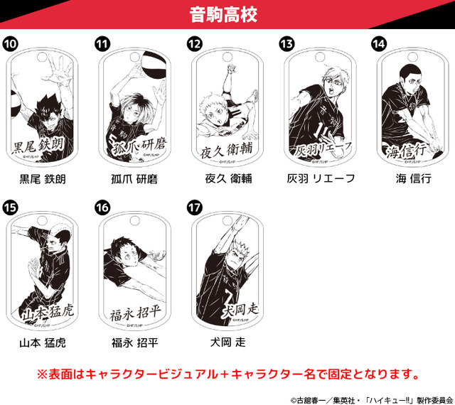 日向・影山・月島・山口ら烏野高校のメンバーから黒尾・孤爪・夜久・灰羽など音駒高校のメンバーまで、躍動感あふれる17種類が用意された。