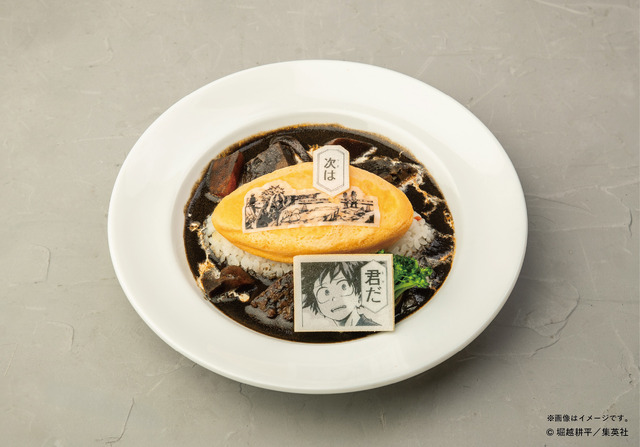 店内では「オールマイトとデクの”次は君だ”~デミグラスオムライス~」や「轟の大氷海嘯!!ドライチーズカレー」などのフードをはじめ、「お茶子とトガちゃんの世界一カァイイミルフィーユケーキ」や「緑谷VS死柄木のオーバーレイワッフルプレート」などのデザート、「緑谷出久のSMASH!!MINT SODA」や「爆豪勝己のBOOM!!SODA」などのドリンクが提供される。