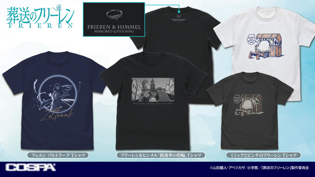 フリーレンとヒンメルの思い出「フリーレン&ヒンメル『鏡蓮華の指輪』Tシャツ」、“暗いよー!! 怖いよー!!”と叫び声が聞こえてきそうな「ミミックとピンチのフリーレン Tシャツ」もあわせてリリースされる。