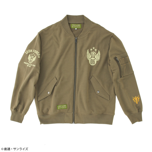 「STRICT-G.ARMS『機動戦士ガンダム』カットMA-1」は、しっかりしたウェイトの裏毛素材を使用。フロント左胸と右袖の肩口にワンポイントプリントをあしらい、左袖にはジッパー付きのシガレットポケットを配置した。