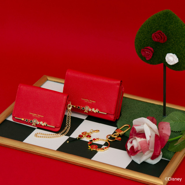 「ハーツラビュル寮」のコレクションは、寮服からイメージされたカラーにトランプや薔薇、女王の冠、ペンキの刷毛などのモチーフが施された「財布」、「パスケース」、「キーリング」がラインナップされた。マジカルペンをイメージした「ファスナーチャーム」は、レッドカラーのストーンが輝く。