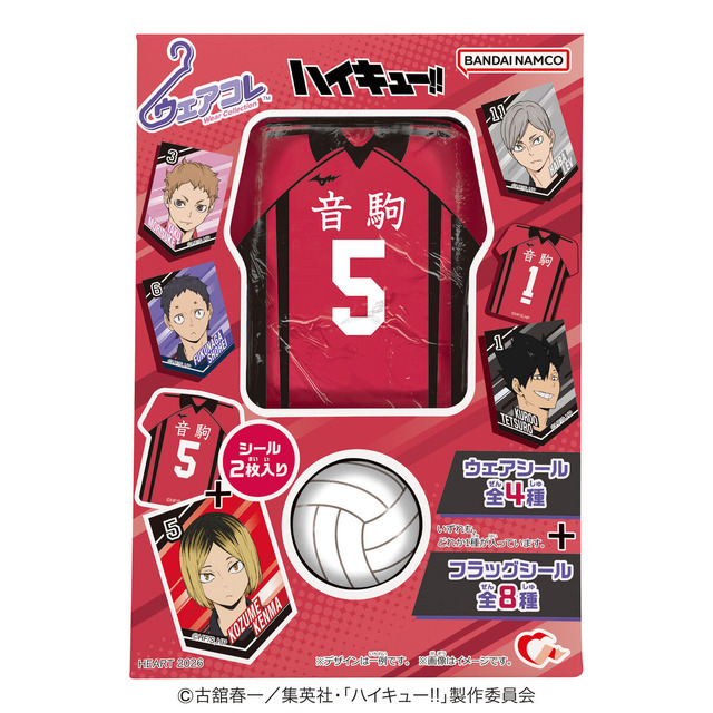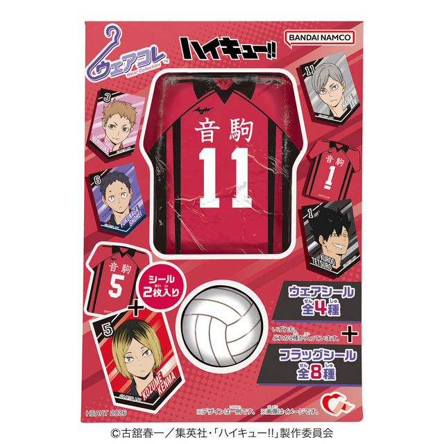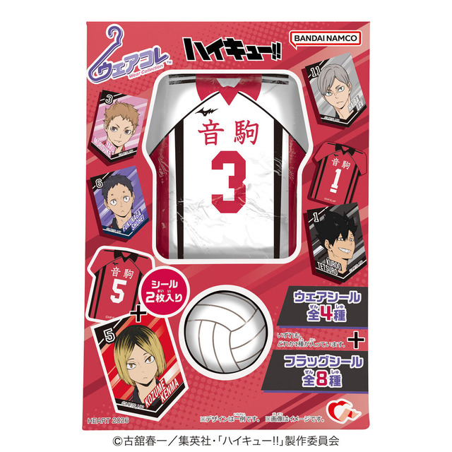 『ハイキュー!!』より音駒高校のユニフォームがデザインされたアルミ巻きチョコが発売される。ユニフォームデザインは孤爪研磨、黒尾鉄朗、夜久衛輔、灰羽リエーフの4人。おまけとしてキャラクターが描かれたフラッグシールとユニフォームが描かれたウェアシールが1枚ずつ付いてくる。