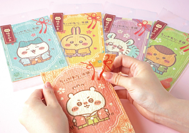 「小風呂敷」と「のれん」は、和装にお着替えしたちいかわたちがあしらわれたおめでたいデザインの代物だ。部屋や鞄の中をぱっと明るくしてくれるだろう。食べるのがもったいない「焼きかま」は、まるでポストカードのような仕上がり。香ばしい風味がやみつきになる。