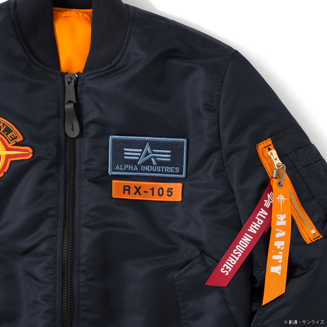 このたびの「STRICT-G × ALPHA INDUSTRY 『機動戦士ガンダム 閃光のハサウェイ キルケーの魔女』MA-1」は、保温性を高めるジッパー内側の比翼や袖のユーティリティポケットなどALPHAならではのディテールはもちろん、袖、襟、裾のリブ仕様が保温効果を高める。