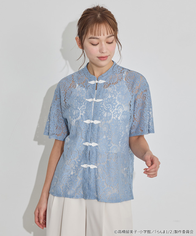 花モチーフのレース生地にチャイナボタンを添えた半袖チャイナシャツ。カラーはブラック、ボルドーのほか、ライトブルーも加わった3種類。