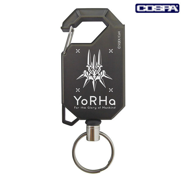 「ヨルハ部隊 リールキーホルダー」は、ガンメタリックにコーティングされたコスパオリジナル形状のリールキーホルダー。リールは約50cmまで伸ばせる仕様で、毎日使うカギ類を付ければとても便利。キーホルダーなどを付けられるストラップホールも付いているので、自分流にカスタマイズが可能。実用性&機能性はもちろん、ファッションのアクセントとしても優れたアイテムだ。