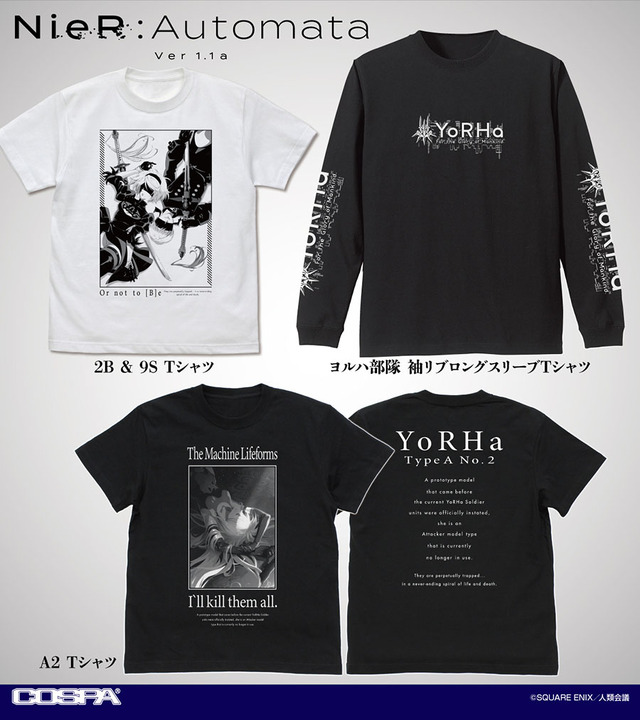 TVアニメ『NieR:Automata Ver1.1a』の新商品が「COSPA(コスパ)」ブランドより発売。2B、9S、A2の「Tシャツ」「パスケース」をはじめ、ヨルハ部隊の「ロングTシャツ」「刺繡ローキャップ」などがラインナップされた。
