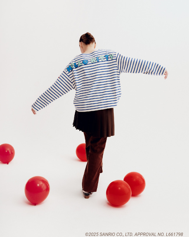 「ボーダーカットソー」は、バックスタイルに大胆に「HELLO KITTY」のロゴがプリントされた、ゆったりとしたサイジングのボーダー柄カットソートップスだ。左袖には、ハローキティのワンポイント刺繍が施されている。身幅と袖幅にゆとりがあるため、抜け感のあるフェミニンなシルエットで着用できるだろう。
