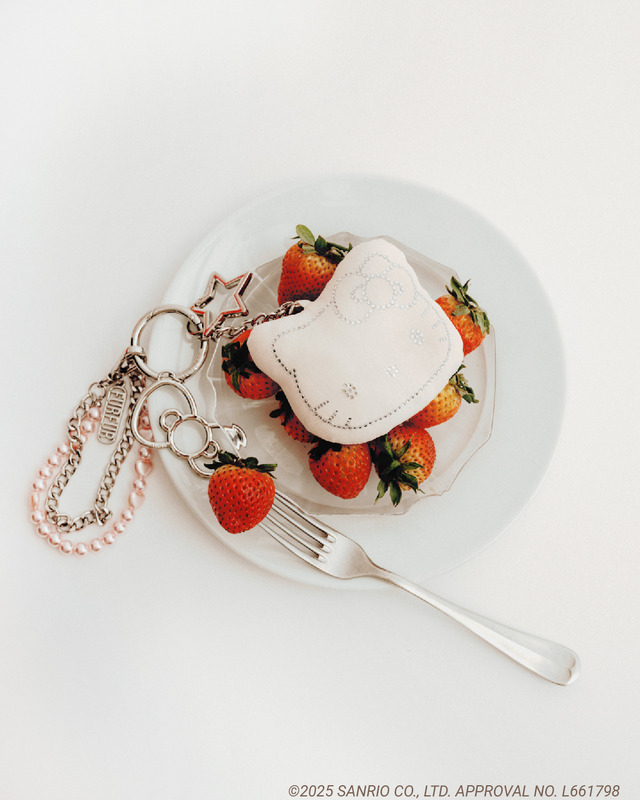 「オリジナルクリスタルチャーム」は、ボリュームのあるクッションにラインストーンで表現された、ハローキティが愛らしい代物だ。パーツはそれぞれ取り外し可能のため、手持ちのチャームとのカスタマイズも楽しめる。バッグチャームとしてはもちろん、ウォレットチェーンのようにベルトループに付けてコーディネートのアクセント使いにも向きそうだ。