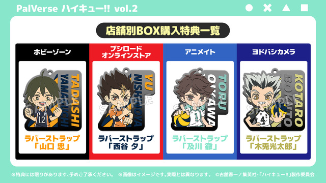 商品はランダム封入で、1BOXを購入すると全種コンプリート可能。対象店舗(ホビーゾーン・ブシロード オンラインストア・アニメイト・ヨドバシカメラ)にてBOXで購入すると、1BOXごとに購入特典がもらえる。特典はキャラクターのラバーストラップで、ホビーゾーンは山口 忠、ブシロード オンラインストアは西谷 夕、アニメイトは及川 徹、ヨドバシカメラは木兎光太郎となっている。