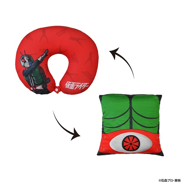 この他には、クッションとしてもネックピローとしても使える仮面ライダー1号、2号がデザインされた「ネックピロー&クッション」、チャーム部分に仮面ライダー1号の「タイフーンユニット」がデザインされたスーツケースに巻き付ける「トラベルケースベルト」も注目だ。