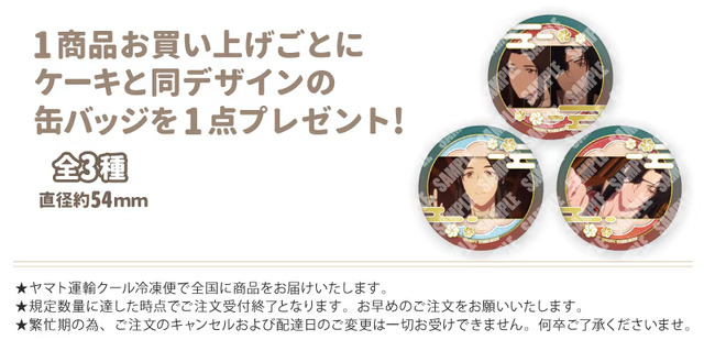 イラストは可食インクでプリントされているので、安心して食べられる。また、たっぷりの甘酸っぱいイチゴが入ったケーキは、購入時に「ホイップクリーム」か「チョコクリーム」を選べる。さらに購入特典として、缶バッジ付きで届くのもファンには嬉しいところ。購入したケーキと同じデザインの缶バッジを、ケーキ1点を購入ごとに1つもらえる。見ても食べても美味しい、好きなBL作品の推しキャラクターで彩られたケーキとともに楽しいクリスマスを過ごしたい。