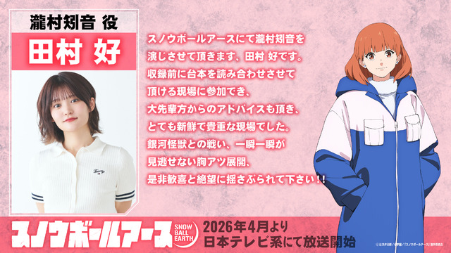 スノウボールアースにて瀧村矧音を演じさせて頂きます、田村 好です。収録前に台本を読み合わせさせて頂ける現場に参加でき、大先輩方からのアドバイスも頂き、とても新鮮で貴重な現場でした。銀河怪獣との戦い、一瞬一瞬が見逃せない胸アツ展開、 是非歓喜と絶望に揺さぶられて下さい!!