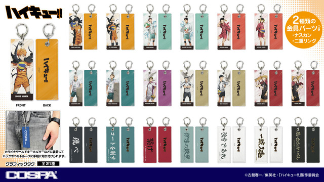 フルカラープリントのタグ型キーホルダー「グラフィックタグ 前進Ver.」は、2種類の金具パーツ付き。ナスカンを使ってバッグやベルトループに装着したり、二重リングで鍵をまとめて持ち歩くことができる。烏野高校の「飛べ」、音駒高校の「「繋げ」など、高校の「グラフィックタグ」にも注目だ。