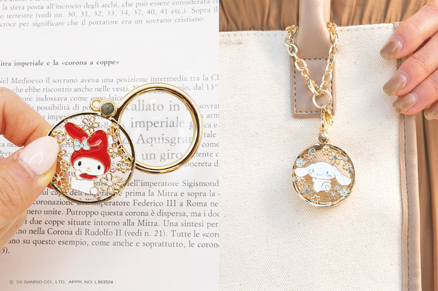 外出先でさりげなく使える、バッグチャームのような「おめかしルーペ」は、ハローキティ、クロミ、マイメロディ、シナモロールの全4種がある。老眼鏡やルーペを持つのに抵抗があるという人に向けた、バッグにつけてさりげなく使えるスライドルーペだ。