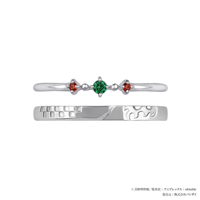 「竈門炭治郎 セットリング」では、石付きリングのセンターに炭治郎をイメージした緑のストーンをセッティングした。サイドに「ヒノカミ神楽」や炭治郎の瞳を連想させる赤いストーンが添えられている。