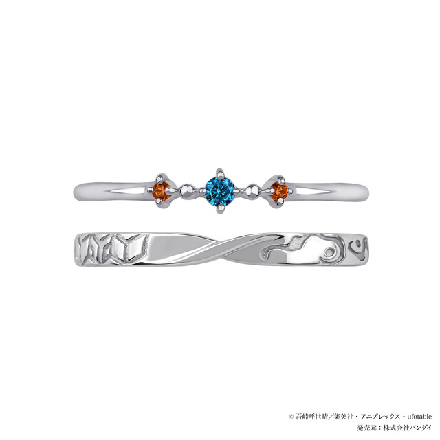 「冨岡義勇 セットリング」は、石付きリングのセンターに義勇らしいブルーのストーンを、サイドに錆兎を思わせるオレンジのストーンを配置。地金リングに羽織の文様と、戦いの中で頬に現れる痣を刻印で表現した。