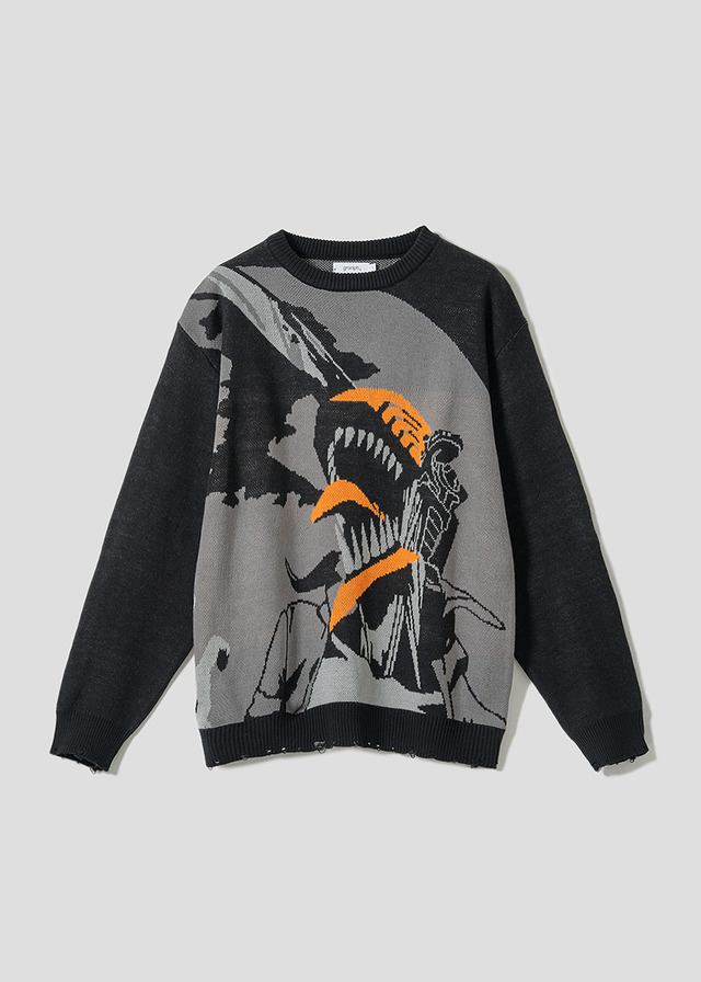 チェンソーマンの迫力ある姿をジャカードで大胆に表現したクルーネックニット。そで口、すそにはダメージ加工を施した。ドロップショルダーでリラックスしたシルエットで着用できる。