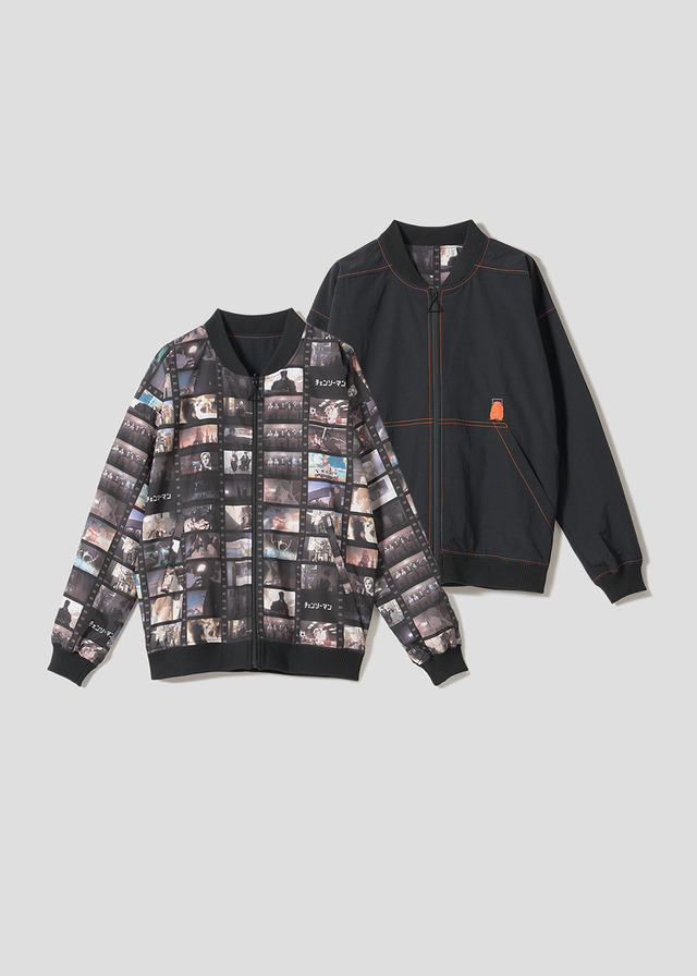 オープニングカットのパターン柄の面と、ポチタの後ろ姿をワンポイント刺繍し、オレンジのステッチでアクセントを効かせたシンプルな面を楽しめるリバーシブル仕様のブルゾン。