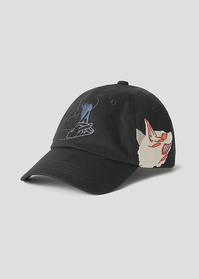 前面に「コン。」のポーズをとる姿、サイドに“狐の悪魔”の頭部を刺繍で表現した。後部には「KON.」の刺繍も。スタンダードな6パネルのベースボールキャップ。アジャスターでサイズ調整もスムーズにできる。