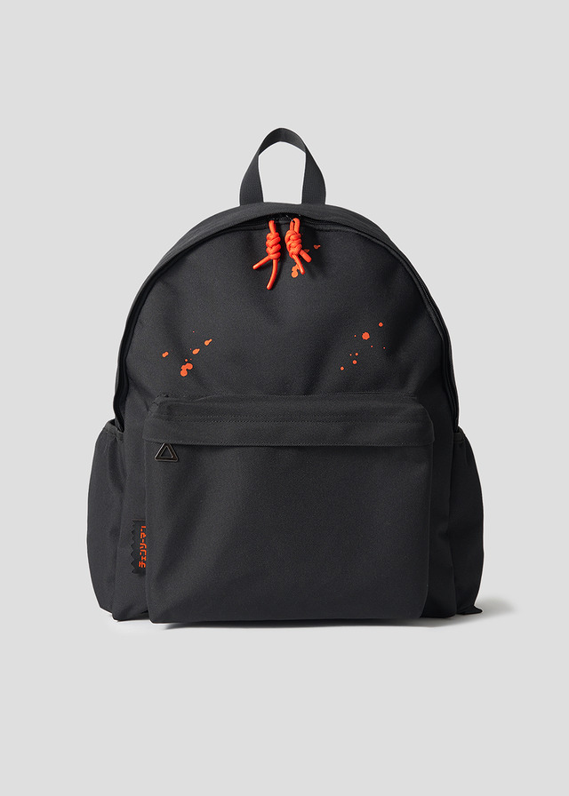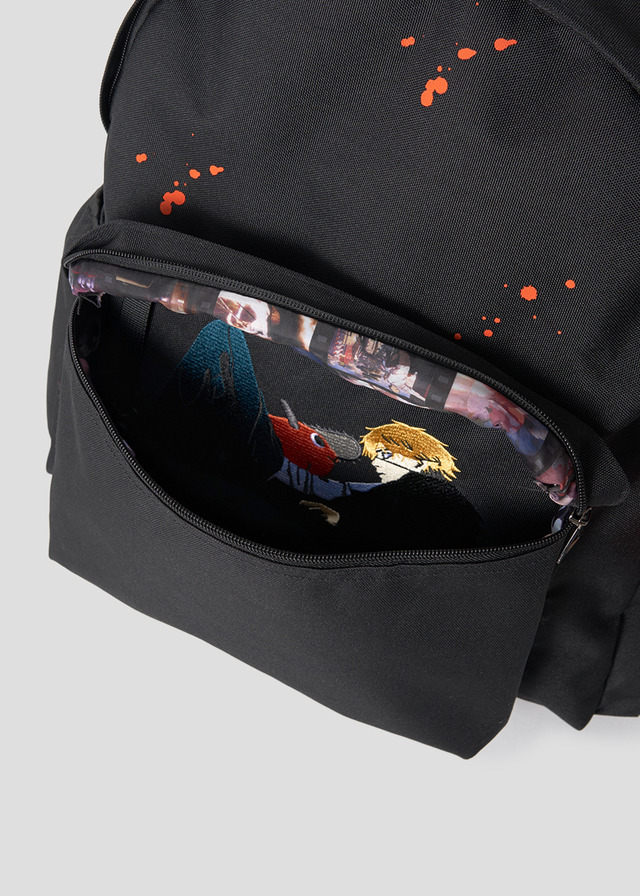 デンジがポチタと会話をするシーンをモチーフに、ポケットをゴミ箱に見立てたベーシックなバックパック。ポケットの中にデンジとポチタを刺繍し、オープニングカットのパターン柄も加えたユニークデザインだ。