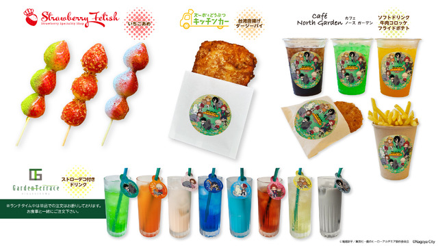 園内4ヵ所のレストラン・キッチンカーでは、キャラクターをイメージしたフードなどオリジナル装飾が付いた全15品のコラボメニューを販売。注文すると全8種のコラボ限定「オリジナルカー」がランダムで1枚付属する。